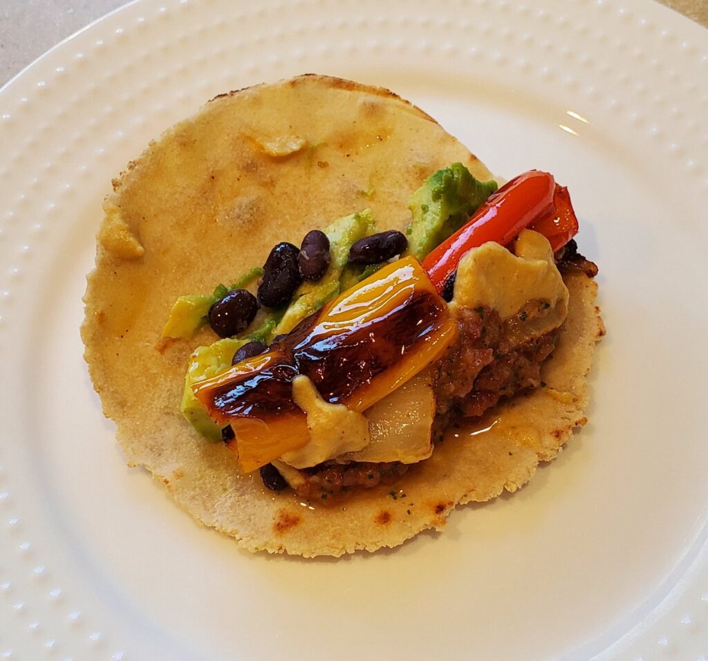 Instead of the usual meat filling, I started with roasted peppers and onions — because roasting brings out that deep, caramelized sweetness that makes vegetables taste like comfort food. I added in black beans for protein and fiber, a creamy vegan cheese sauce (still experimenting with recipes there — so stay tuned!), buttery slices of avocado, and, of course, my homemade salsa. My salsa recipe has a fresh zing that helps tie it all together for me.